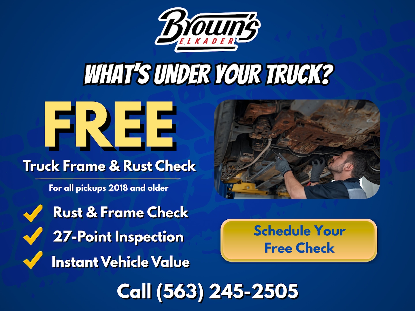 Just give us a call and ask for our FREE Rust & Frame Check. We'll put your truck on a lift, inspect the frame and underbody, and clearly explain what we see.
